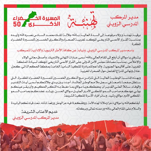 تهنئة مدير المركب المدرسي الزويني لجلالة الملك بمناسبة الذكرى الخمسين للمسيرة الخضراء المظفرة
